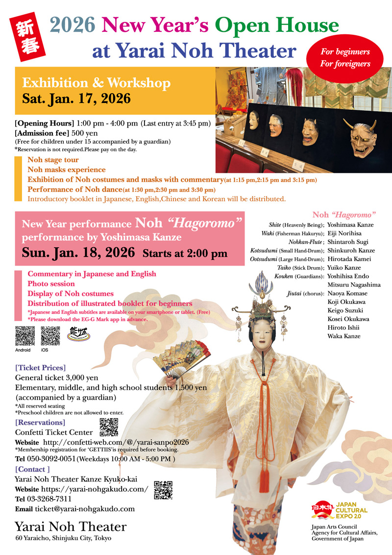The beauty of Noh lies in the harmony of stillness and motion. “Hagoromo” features the celestial maiden’s graceful dance and the fisherman’s passionate expressions. We hope you will appreciate the delicate beauty of Noh through this performance.