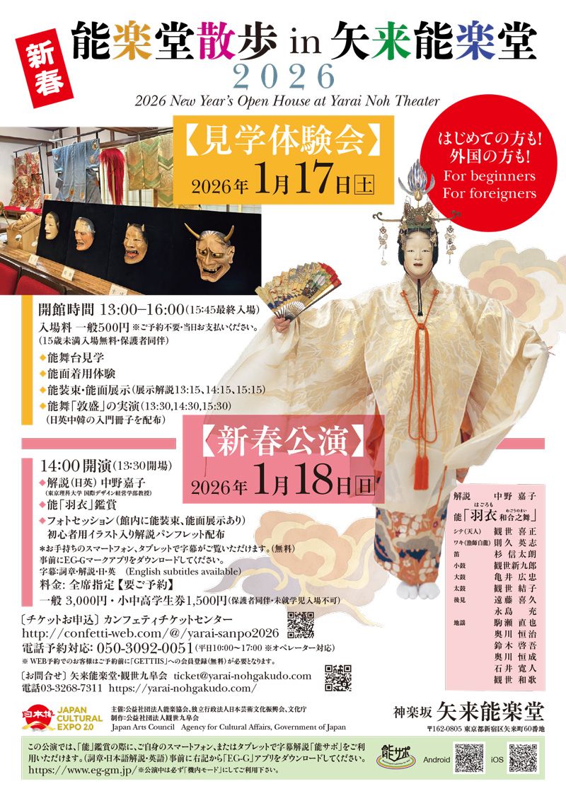 古代の伝説を舞台上に再現する『羽衣』は、能楽の優雅さと神秘性を象徴する公演です。この特別な日に、美しい物語と舞の調和をぜひお楽しみください。